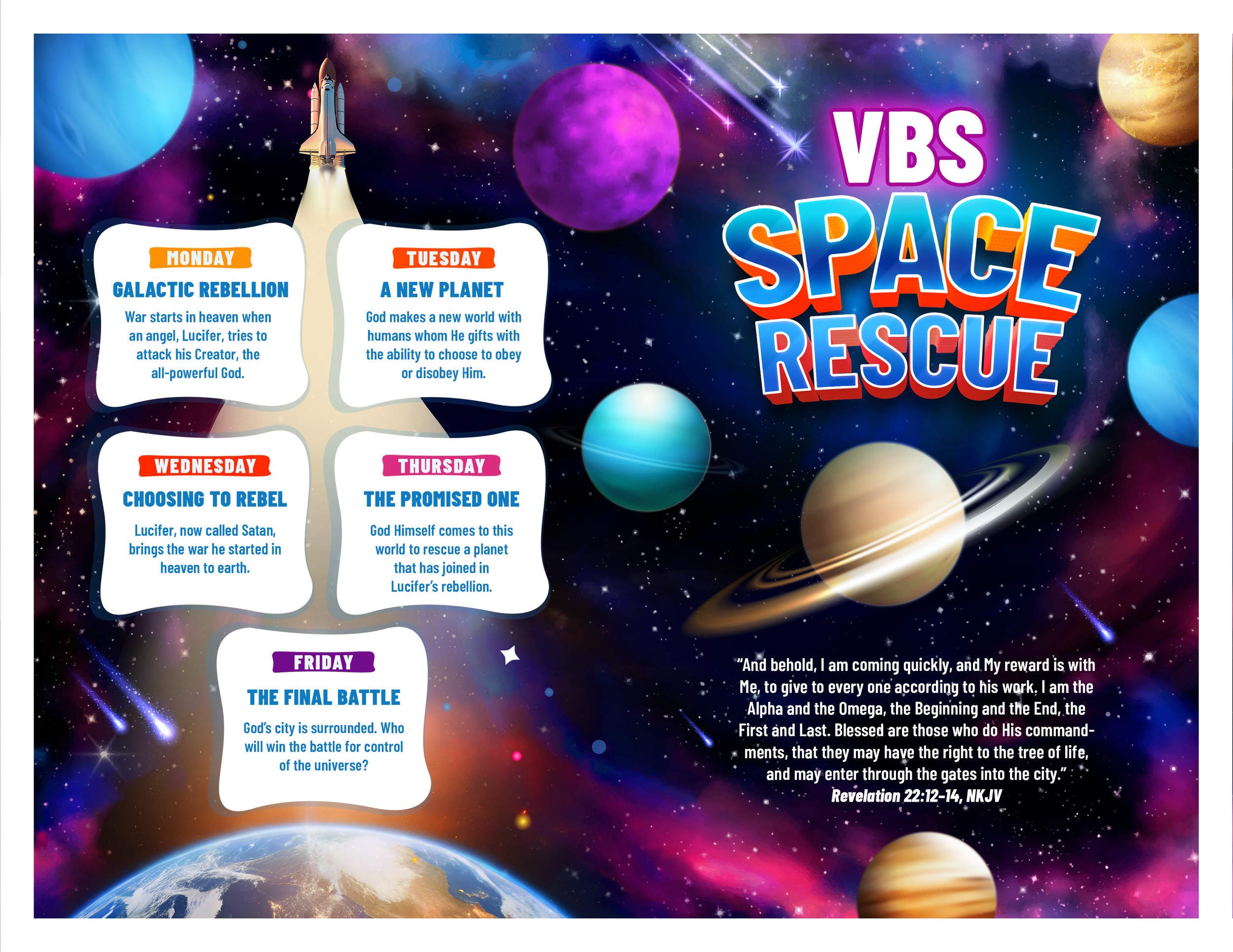 Are you ready for the ultimate mission? This summer, join us for VBS Space Rescue, where we'll journey through the stars to discover the greatest rescue story ever told. From a galactic rebellion to the final victory, kids will explore how God's love reaches across the universe to save us. Secure your seat on the shuttle-the countdown to an unforgettable week begins now! Join us on a fun, five-day VBS adventure for children ages 4-12 as we learn about Space Rescue. Meal will be provided.